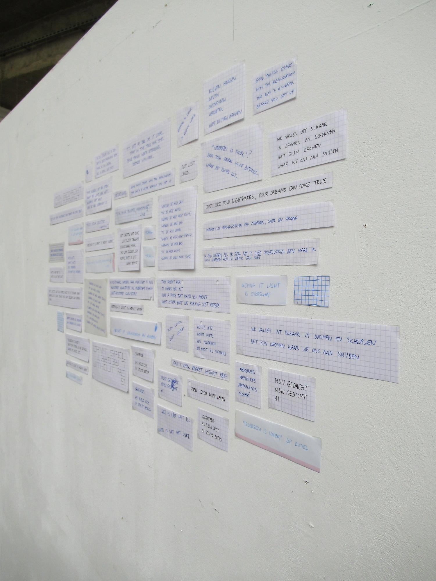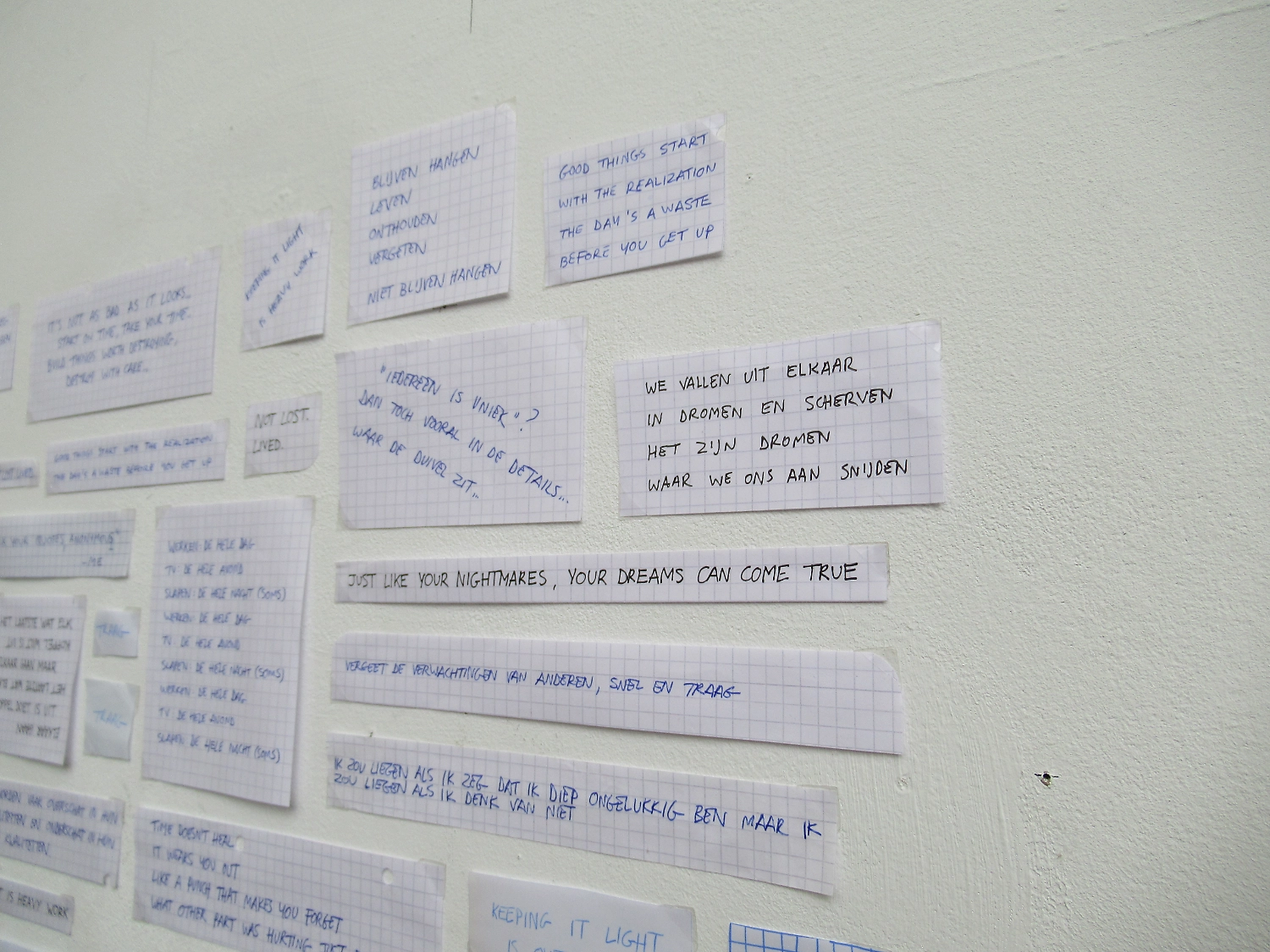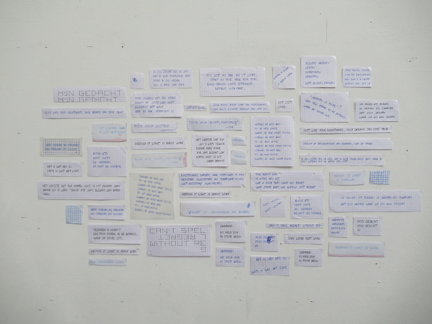 Al snel besefte ik echter dat het doorgeven van een stuk papier – al dan niet clandestien – een drempel vormde. Ik zocht naar een manier om het communicatieve aspect te minimaliseren en een zekere afstand te creëren.