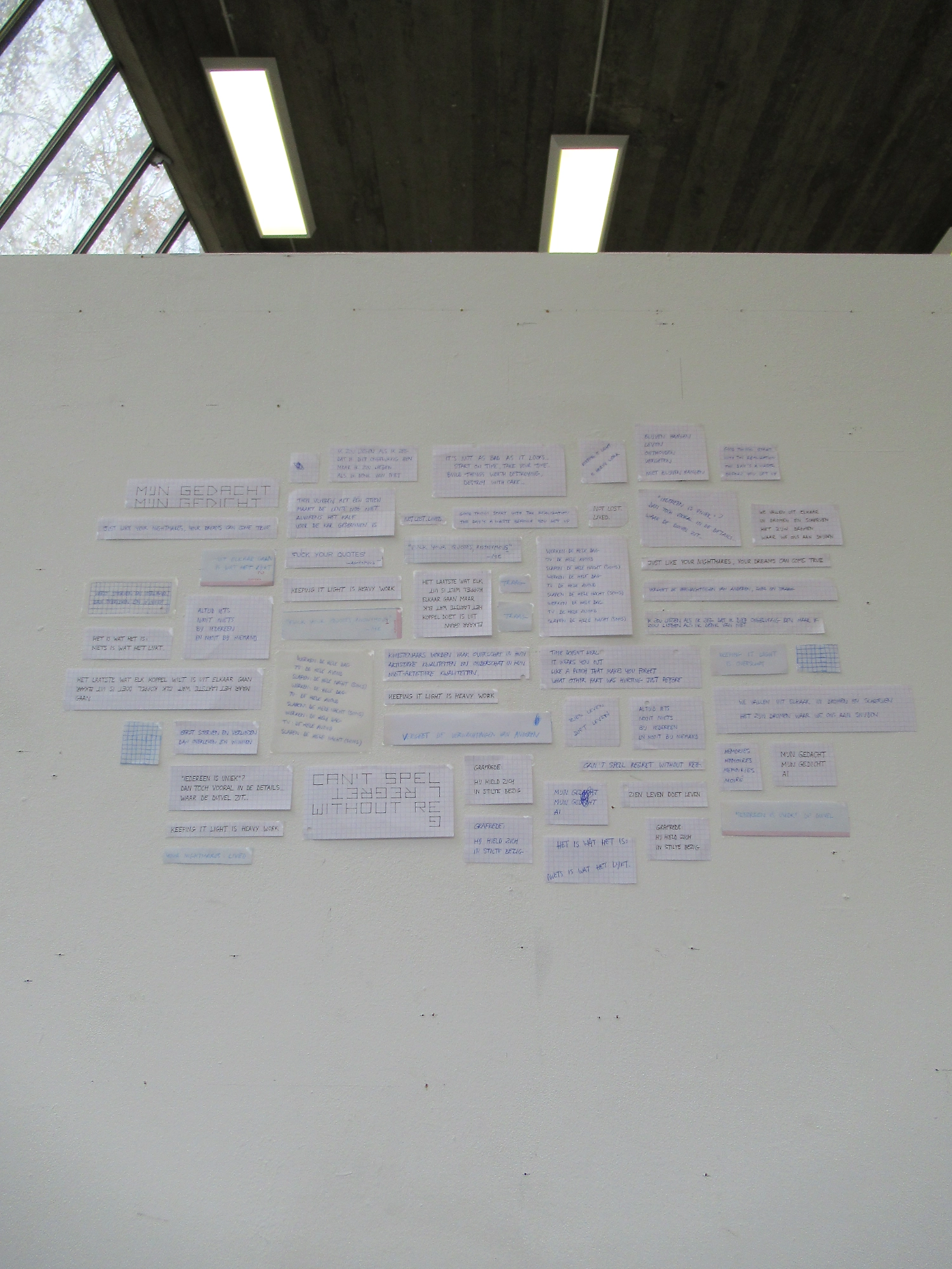 Niet al deze geschriften laten zich even goed vertalen naar hetzelfde medium. Sommige zijn misschien geschikt voor posters, andere voor een boekje en weer andere misschien voor voordracht. Het object uit het Stasi-museum diende als katalysator en zette me ertoe aan om alles met de hand op aparte stukjes ruitjespapier te schrijven.